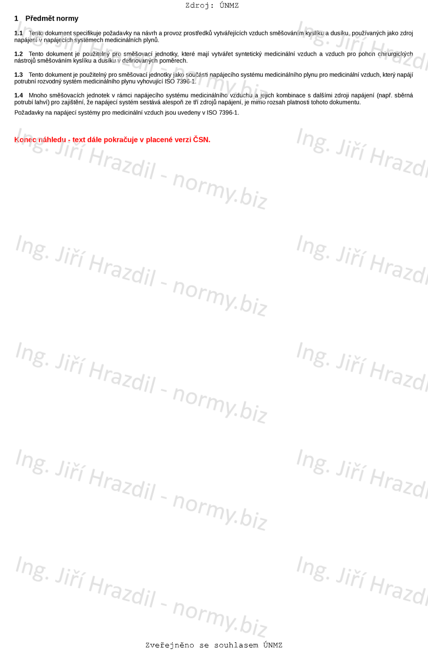 Tato mezinárodní norma specifikuje požadavky na směšovací jednotky, tedy na prostředky vytvářející vzduch směšováním kyslíku a dusíku, používané jako zdroj napájení v napájecích systémech medicinálních plynů. Norma je použitelná pro směšovací jednotky, které vytvářejí syntetický medicinální vzduch a vzduch pro pohon chirurgických nástrojů směšováním kyslíku a dusíku v definovaných poměrech a pro směšovací jednotky jako součásti napájecího systému medicinálního plynu pro medicinální vzduch.